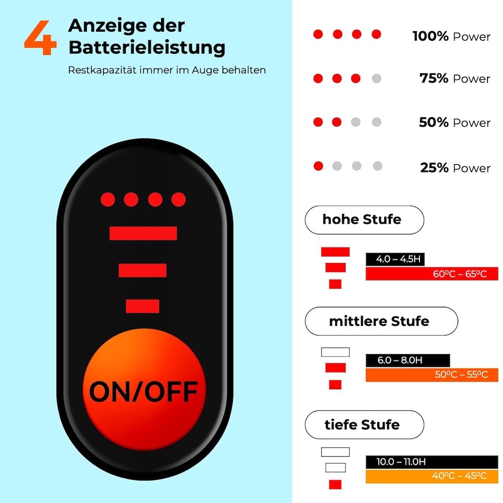 Drei Temperaturstufen (niedrig, mittel, hoch) sorgen für individuelle Wärme:- Stufe 1: Niedrig (1 LED-Licht): 35–40 °C, 10,0–11,0 Stunden