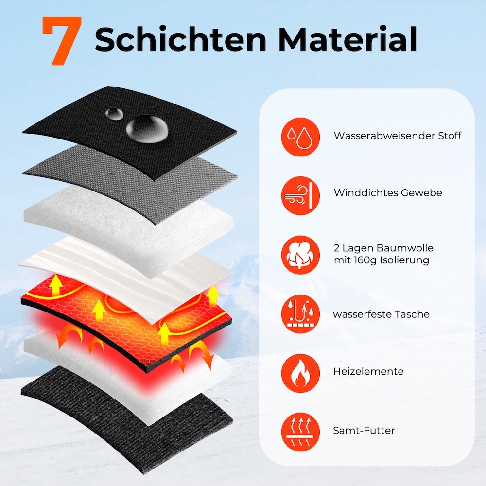 Die SummitAlps Heizhandschuhe sind aus flammenhemmender Baumwolle gefertigt und bieten nicht nur eine hervorragende Wasseraufnahme, Atmungsaktivität und Elastizität, sondern auch eine einzigartige Sicherheit. Die integrierten Ferninfrarot-Heizelemente fördern die Blutzirkulation und sorgen für zusätzlichen Komfort bei jedem Handgriff.Pflegeleicht: