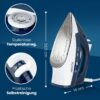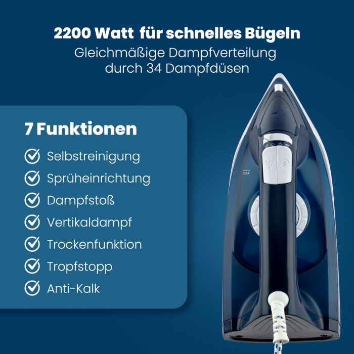 - 7 Funktionen: – Sprüheinrichtung – Dampfstoss – Vertikaldampf – Trockenfunktion (Dampf kann abgeschaltet werden) – Selbstreinigungsfunktion (zuschaltbar) – Tropfstopp – Anti-Kalk