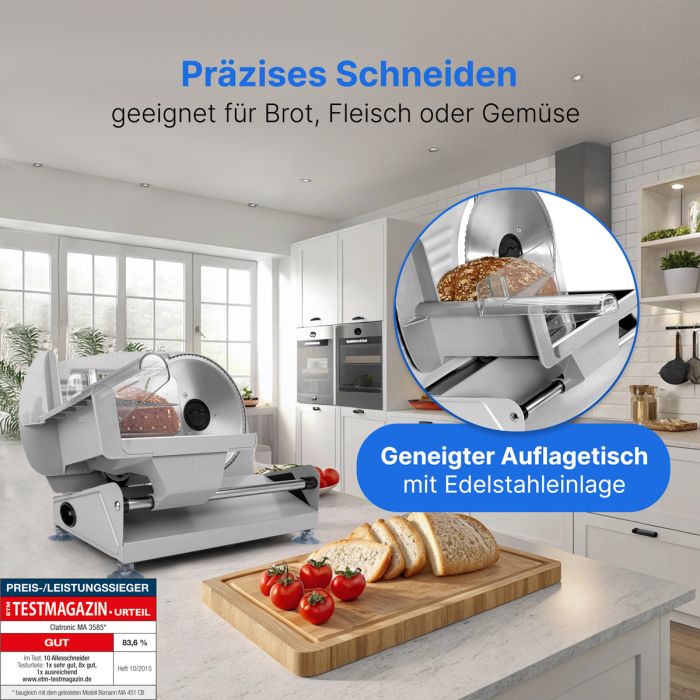 Der Clatronic® MA 3585 Allesschneider ist ein zuverlässiger Begleiter in Ihrer Küche. Mit seinem grossen Edelstahlmesser und dem Universalwellenschliff schneidet er nicht nur Brot, sondern auch Wurst, Käse und mehr präzise und mühelos. Die stufenlos einstellbare Schnittstärke von 0–15 mm ermöglicht es Ihnen, die Dicke Ihrer Scheiben nach Ihren Wünschen anzupassen. Das robuste Motorgehäuse aus Alu-Druckguss sorgt für eine lange Lebensdauer, während der geneigte Auflagetisch mit Edelstahleinlage die Reinigung zum Kinderspiel macht.