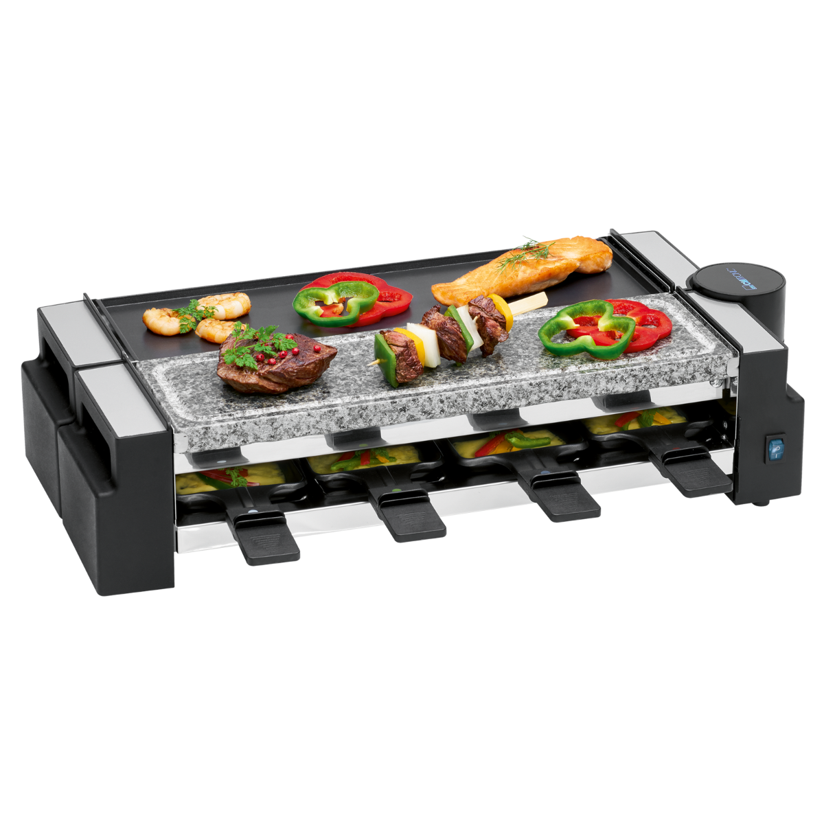 - Raclette-Grill mit heißem Stein und Wendegussplatte