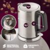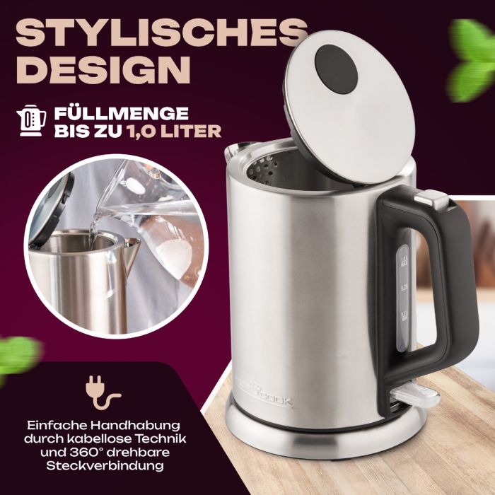Das Edelstahlgehäuse verleiht dem Wasserkocher eine moderne und elegante Note, während das verdeckte Edelstahlheizelement für eine sichere und zuverlässige Leistung sorgt. Verabschieden Sie sich von langen Wartezeiten – der Wasserkocher bringt bis zu 1,0 Liter Wasser in kürzester Zeit zum Kochen. Ob für eine entspannende Tasse Tee am Abend oder eine schnelle Tasse Kaffee am Morgen, dieser Wasserkocher erfüllt Ihre Bedürfnisse im Handumdrehen.