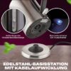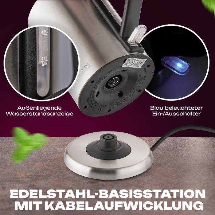 Der Edelstahl Wasserkocher verfügt über einen blau beleuchteten Ein-/Ausschalter, der nicht nur praktisch ist, sondern auch einen Hauch von Stil in Ihre Küche bringt. Und mit der Edelstahl-Basisstation, die eine Kabelaufwicklung bietet, können Sie den Wasserkocher problemlos verstauen und Ihre Arbeitsfläche ordentlich halten.