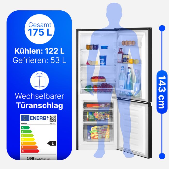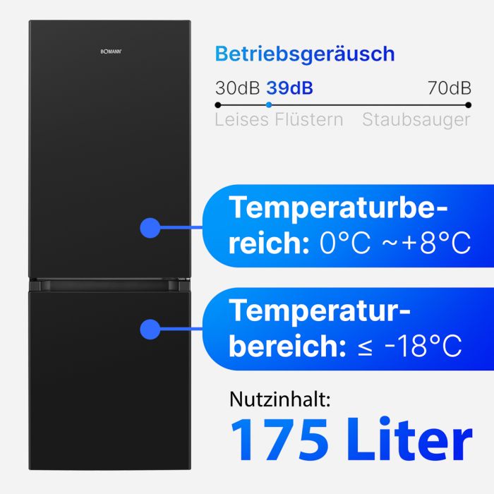 Die Bomann Kühl-/Gefrierkombination KG 320.2 in edlem Schwarz bietet moderne Kühl- und Gefriertechnik kombiniert mit stilvollem Design. Ideal für alle, die Wert auf Zuverlässigkeit und ein elegantes Erscheinungsbild in der Kuche legen.