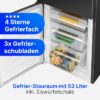 Mit seiner Höhe von 143 cm passt er selbst in kleinere Küchen. Dank Energieklasse E kühlen Sie effizient, während das 4-Sterne-Gefrierfach mit 3 Schubladen und das geräumige Kühlfach mit höhenverstellbaren Glasablagen für Ordnung und Frische sorgen.