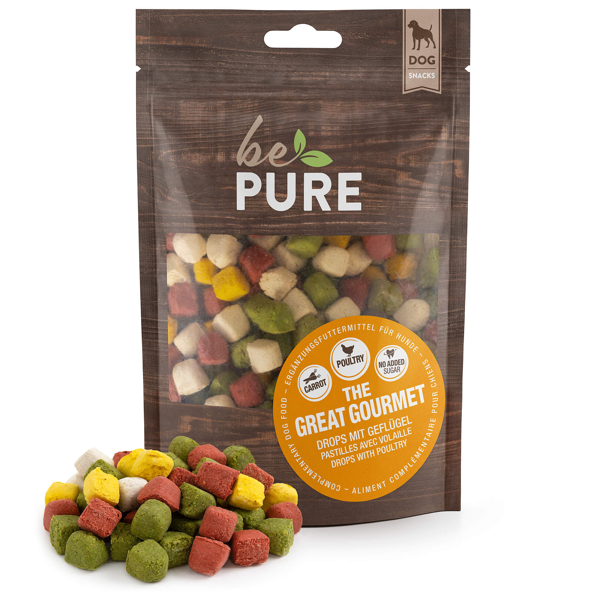 Unsere Biscuits The Great Gourmet von bePure sind der ideale Hundesnack für unterwegs. Der Snack besteht aus Geflügel, Karotten und Erbsen. Die bunten Biscuits sind nicht nur ein echter Hingucker, für deine Fellnase sind sie auch ein perfekter Leckerbissen.